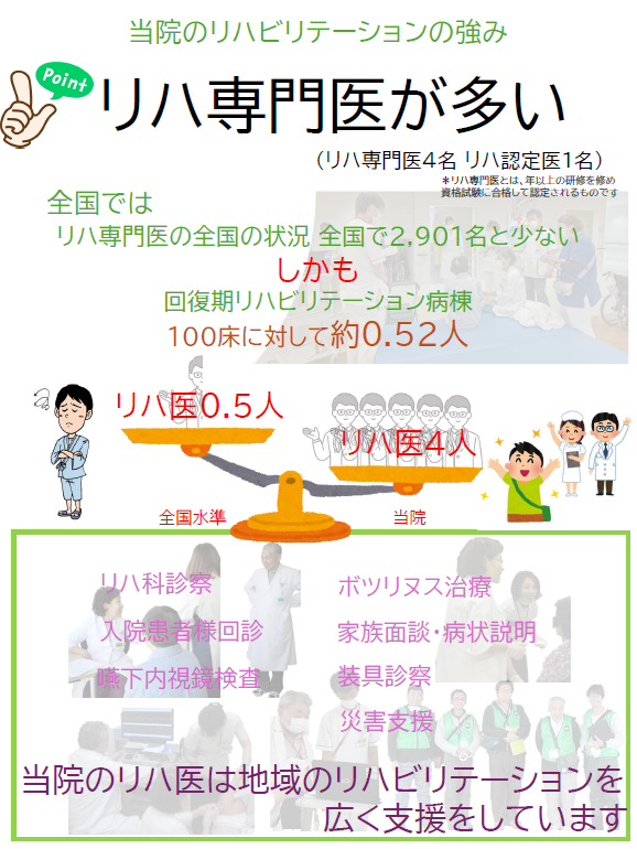 当院では医師6(リハビリテーション科専門医4名)名、理学療法士・作業療法士・言語聴覚士、約130名でリハビリテーションを提供しています。入院では急性期から回復期まで、病棟看護師、ライフメイト(介護士)、ソーシャルワーカー、薬剤師、管理栄養士なども加わって、途切れることのない集中的な診療を行い、地域の皆さまに安心満足していただけるようなリハビリテーション体制をつくることを心がけています(回復期は1年365日、1日最大3時間のリハビリテーションを実施しています)。地域の基幹急性期病院である君津中央病院や帝京大学ちば総合医療センターとも密な医療連携がとれる体制をつくっております。