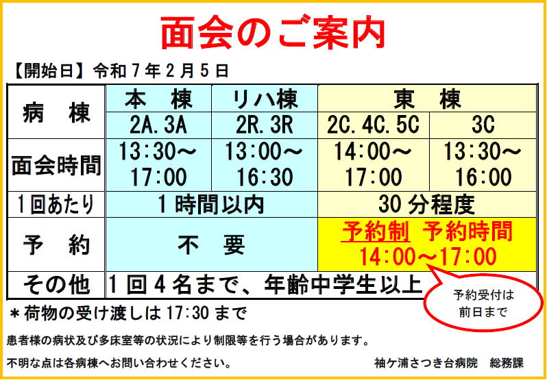 本棟:13:30〜17:00 ※3Cは13:30〜16:00 ※東棟は予約制です。前日までにご連絡ください。 リハケア棟:13:00〜16:30 |
